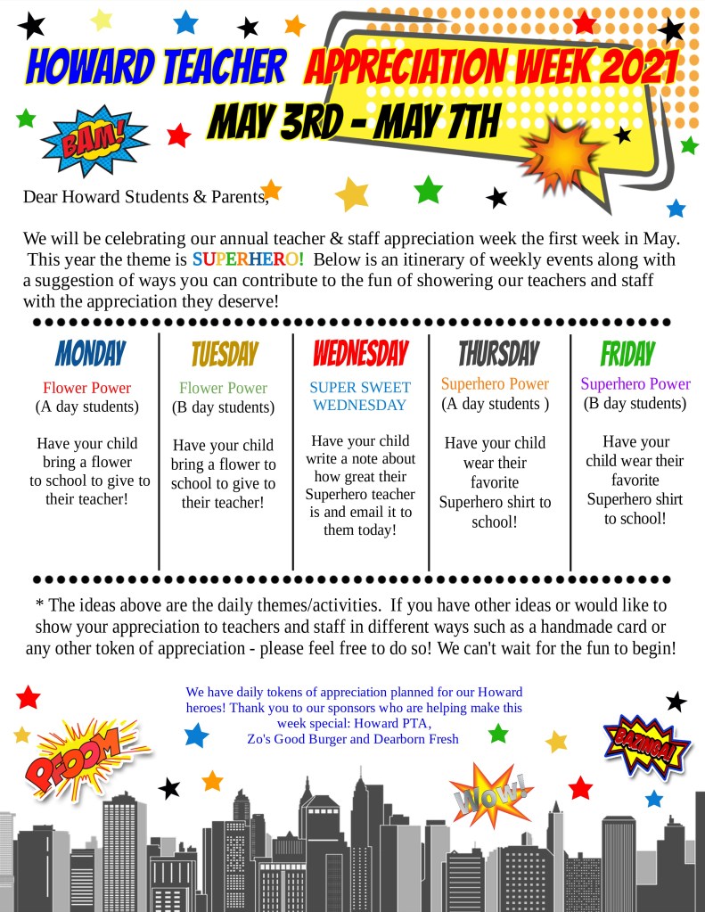 It’s that time of year when we show our Howard teachers and staff how much we appreciate all that they do for our students. This year’s theme is Superheroes. Below is a list of ways your student can help contribute to this special week.